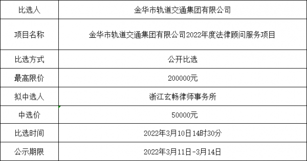 金華市軌道交通集團有限公司2022年度法律顧問服務(wù)項目中選公示