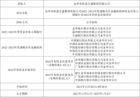 金華市軌道交通集團(tuán)有限公司2022-2023年度戰(zhàn)略合作金融機(jī)構(gòu)和資金存放入圍銀行及2022年初資金存放項(xiàng)目中標(biāo)公示