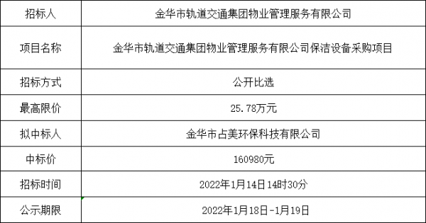 金華市軌道交通集團(tuán)物業(yè)管理服務(wù)有限公司保潔設(shè)備采購項目中選公告