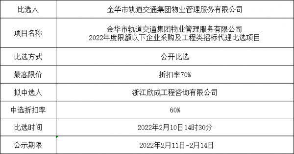 金華市軌道交通集團(tuán)物業(yè)管理服務(wù)有限公司2022年度限額以下企業(yè)采購及工程類招標(biāo)代理比選項目中選公示